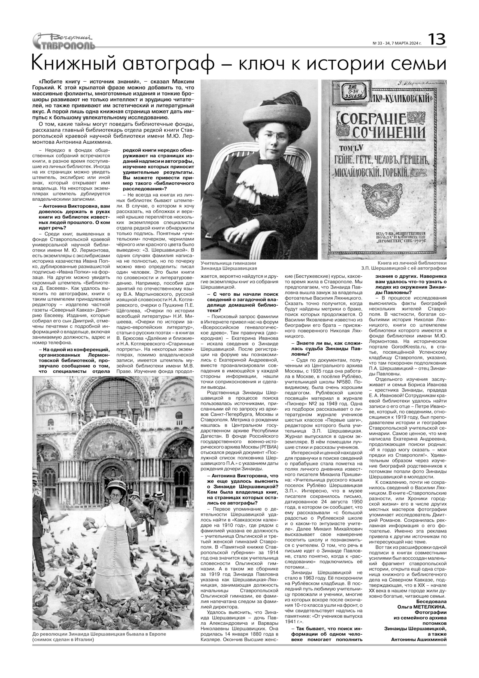 – В процессе исследования выяснились факты биографий нескольких жителей Ставрополя. В частности, богатая событиями история Николая Ляхницкого, книги со штемпелем библиотеки которого имеются в фонде библиотеки имени М.Ю. Лермонтова. На историческом портале GorodKresta.ru, в статье, посвящённой Успенскому кладбищу Ставрополя, указано, что там похоронен подполковник П.А. Шершавицкий – отец Зинаиды Павловны.